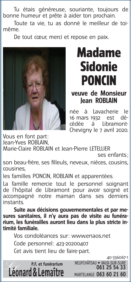 Décédée à Libramont-Chevigny (6800) le mardi 7 avril 2020 à l'âge de 88 ans