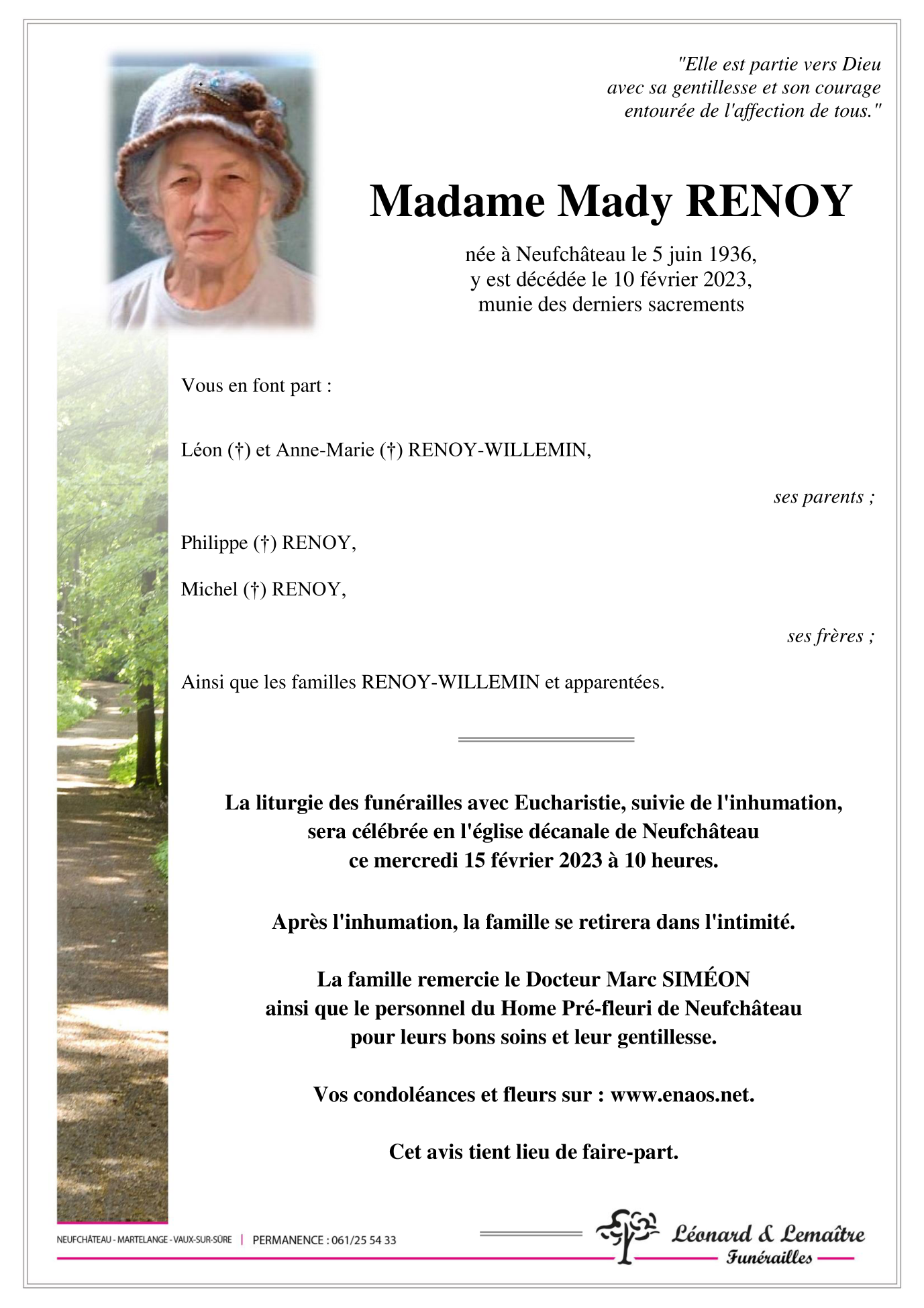Décédée à Neufchâteau (6840) le vendredi 10 février 2023 à l'âge de 86 ans