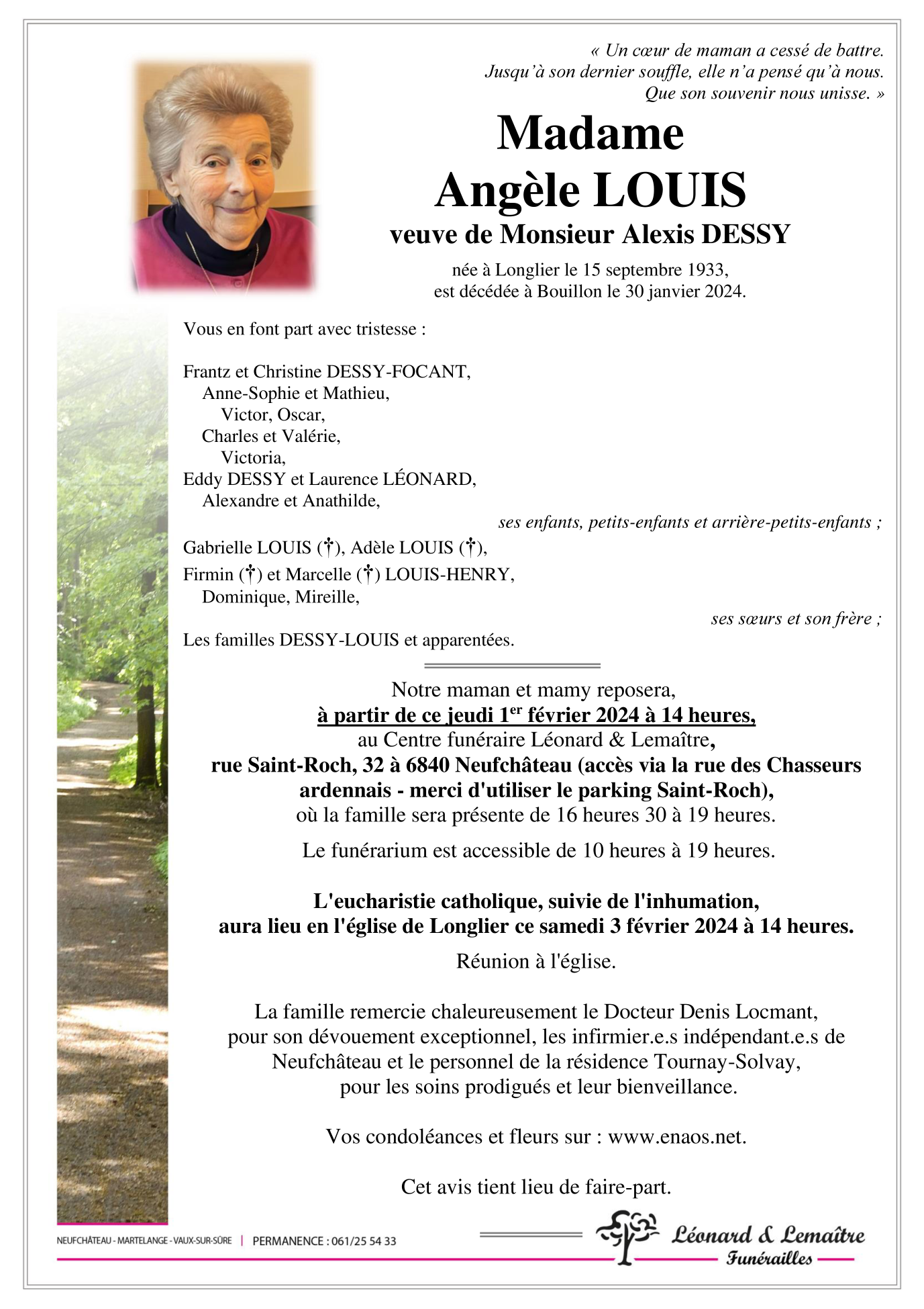 Décédée à Bouillon (6830) le mardi 30 janvier 2024 à l'âge de 90 ans
