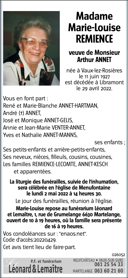 Madame Marie-Louise REMIENCE