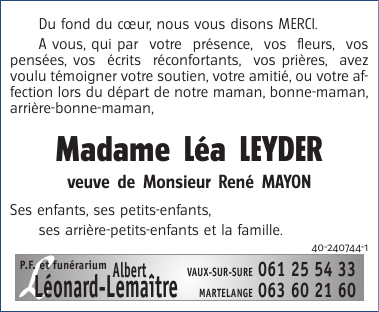 Décédée à Laneuville (6800) le mercredi 13 avril 2016 à l'âge de 89 ans