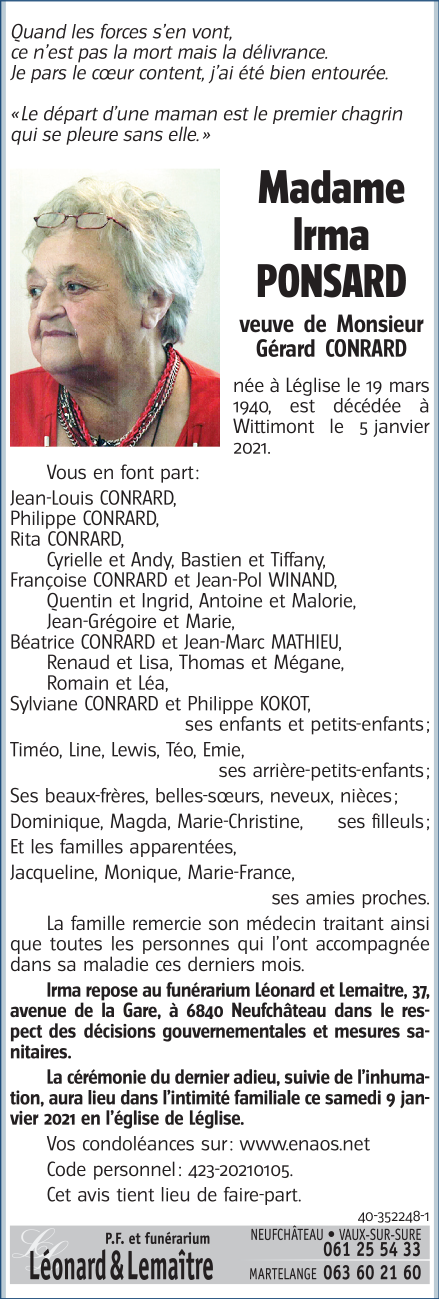 Décédée à Léglise (6860) le mardi 5 janvier 2021 à l'âge de 80 ans
