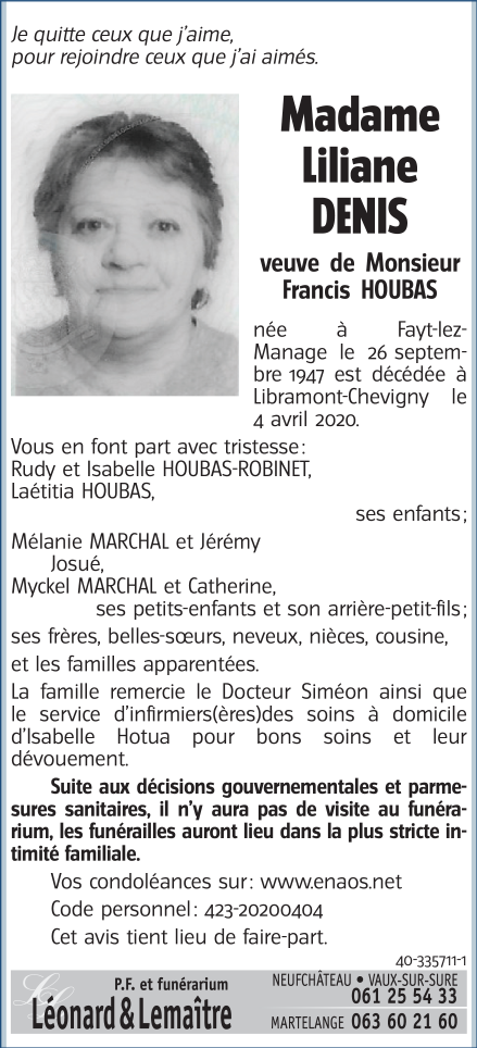 Décédée à Libramont-Chevigny (6800) le samedi 4 avril 2020 à l'âge de 72 ans