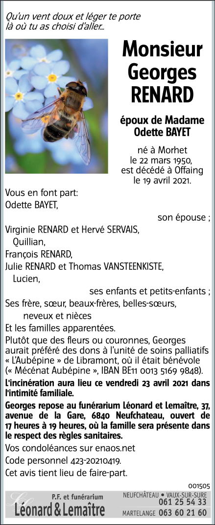 Décédé à Neufchâteau (6840) le lundi 19 avril 2021 à l'âge de 71 ans