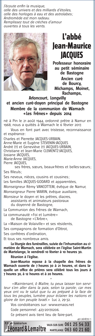 Décédé à Warnach (6637) le lundi 6 février 2017 à l'âge de 72 ans
