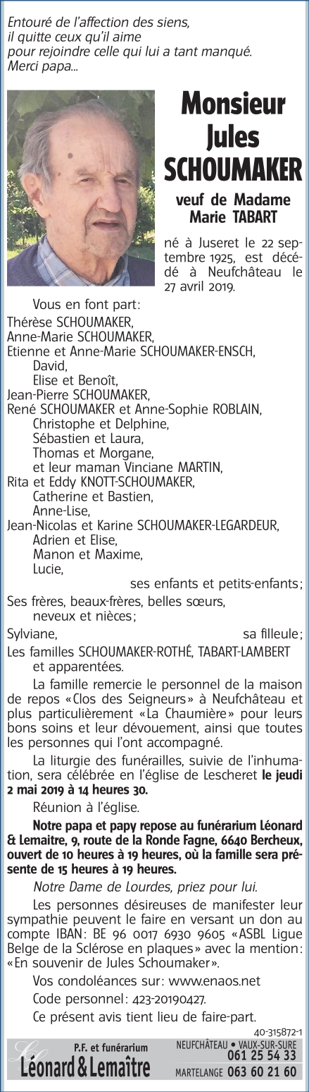 Décédé à Neufchâteau (6840) le samedi 27 avril 2019 à l'âge de 93 ans