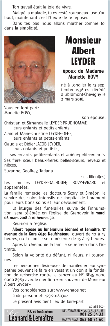 Décédé à Libramont-Chevigny (6800) le vendredi 2 mars 2018 à l'âge de 81 ans