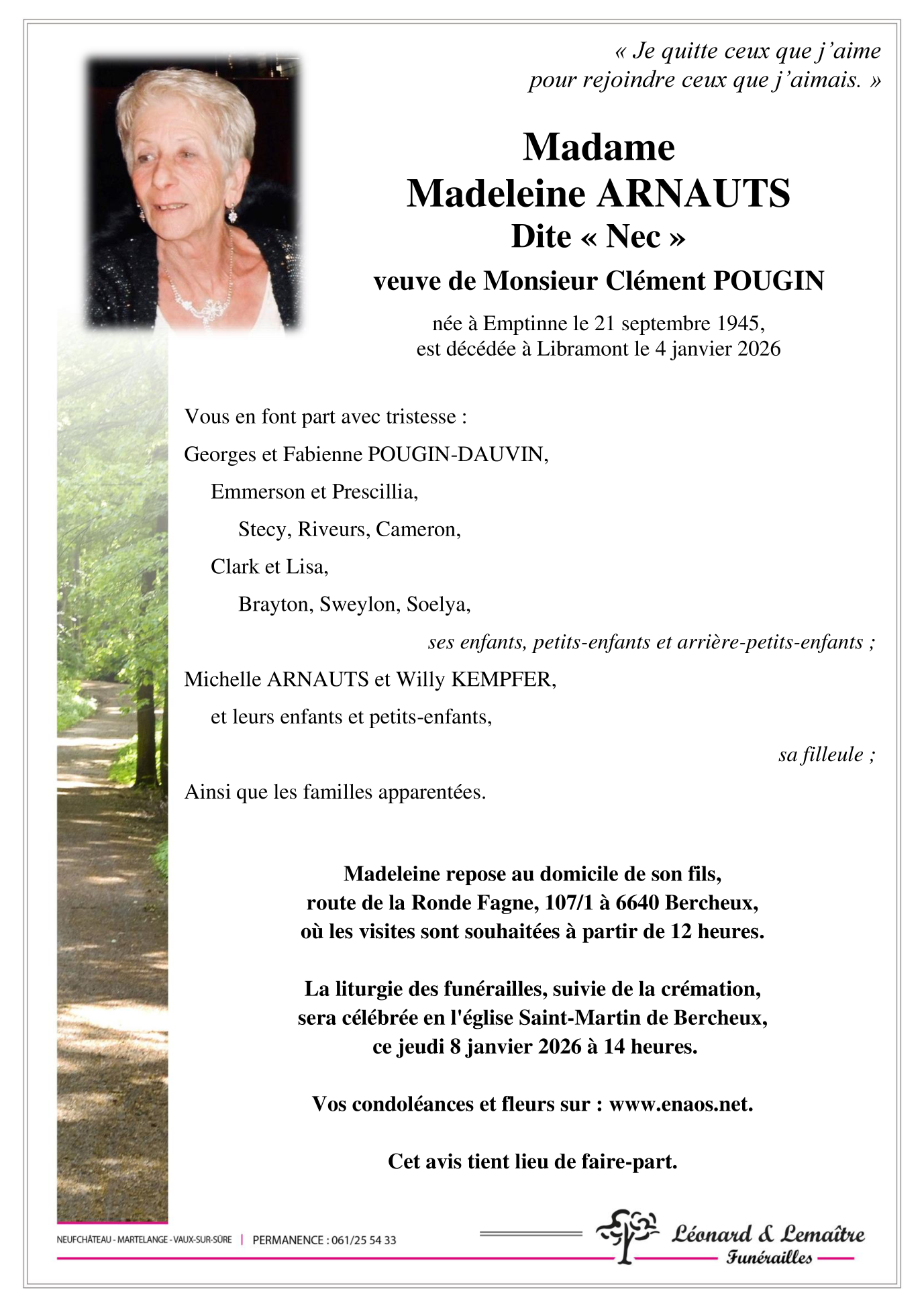 Décédée à Libramont-Chevigny (6800) le dimanche 4 janvier 2026 à l'âge de 80 ans