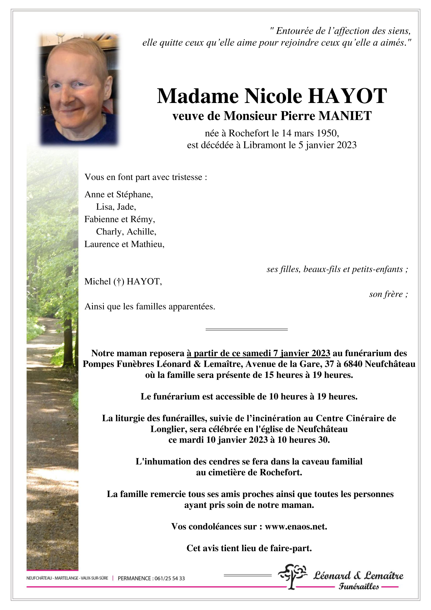 Décédée à Libramont-Chevigny (6800) le jeudi 5 janvier 2023 à l'âge de 72 ans