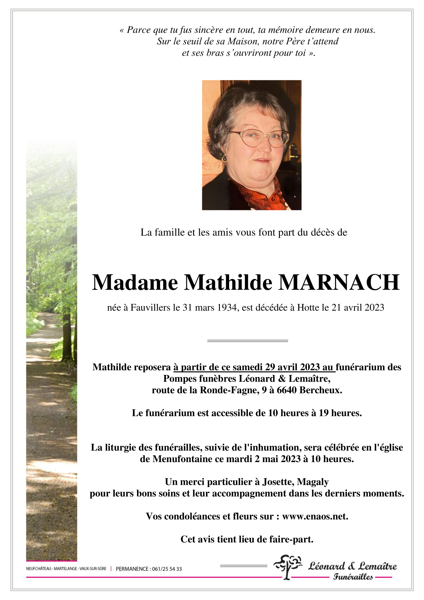 Décédée à Hotte (6637) le vendredi 21 avril 2023 à l'âge de 89 ans