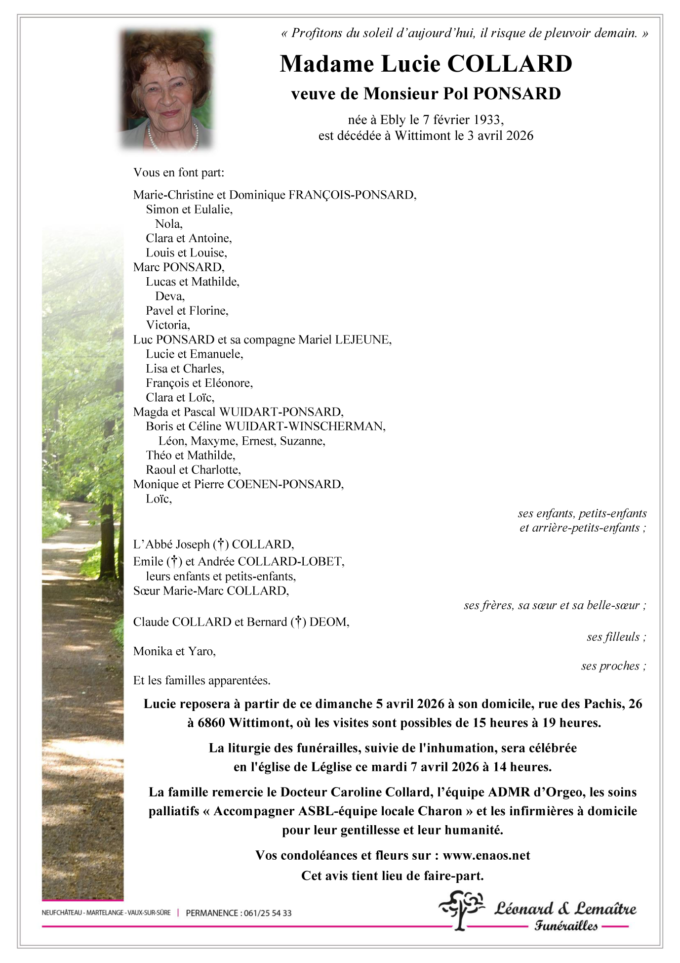 Décédée à Wittimont (6860) le vendredi 3 avril 2026 à l'âge de 93 ans