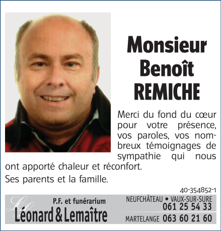Décédé à Hotte (6637) le samedi 6 février 2021 à l'âge de 48 ans