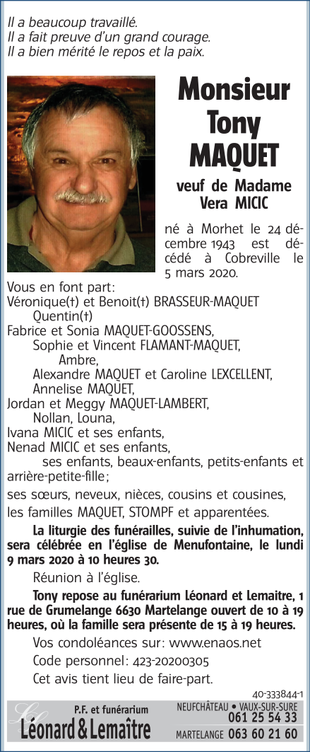 Décédé à Vaux-sur-Sure (6640) le jeudi 5 mars 2020 à l'âge de 76 ans
