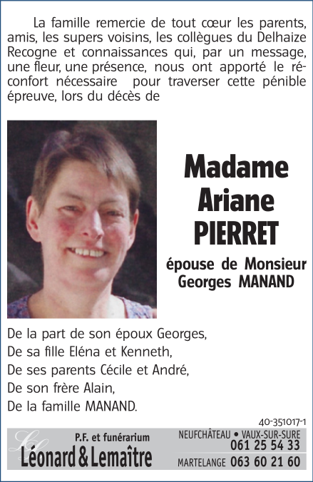 Décédée à Neufchâteau (6840) le mardi 1 décembre 2020 à l'âge de 47 ans