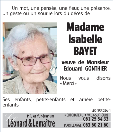Décédée à Libramont-Chevigny (6800) le jeudi 18 février 2021 à l'âge de 98 ans