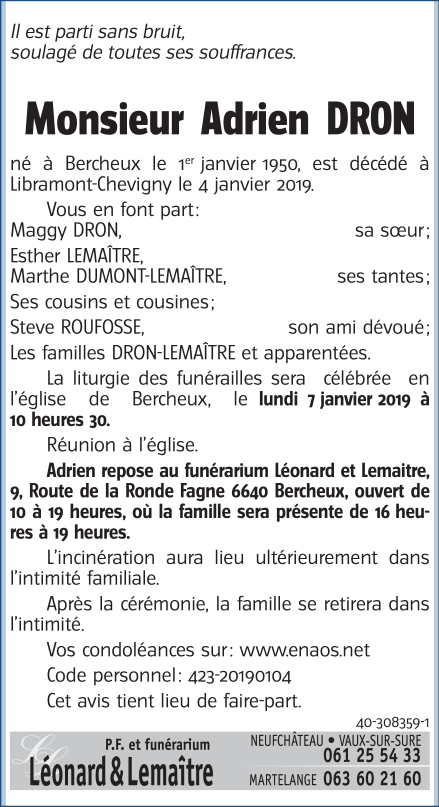 Décédé à Libramont (6800) le vendredi 4 janvier 2019 à l'âge de 69 ans