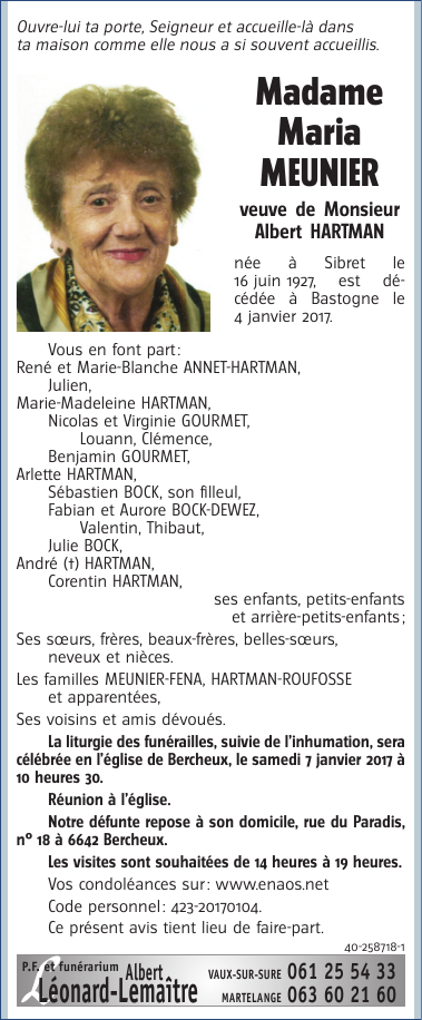 Décédée à Bastogne (6600) le mercredi 4 janvier 2017 à l'âge de 89 ans