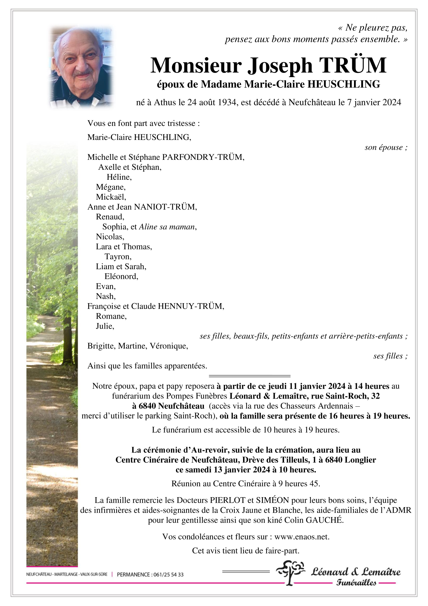 Décédé à Neufchâteau (6840) le dimanche 7 janvier 2024 à l'âge de 89 ans