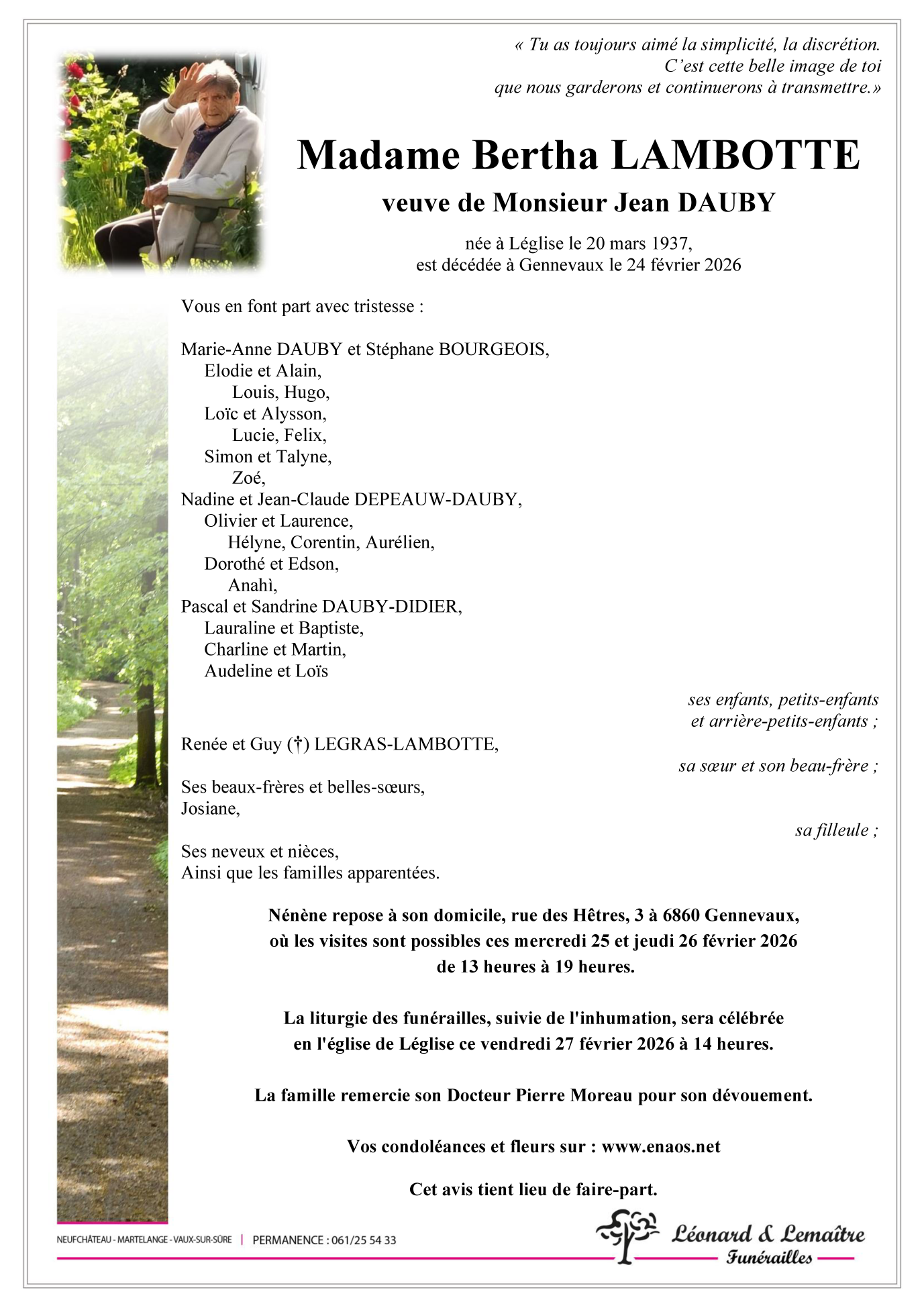 Décédée à Gennevaux (6860) le mardi 24 février 2026 à l'âge de 88 ans