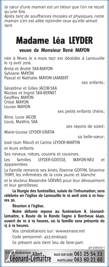 Décédée à Laneuville (6800) le mercredi 13 avril 2016 à l'âge de 89 ans
