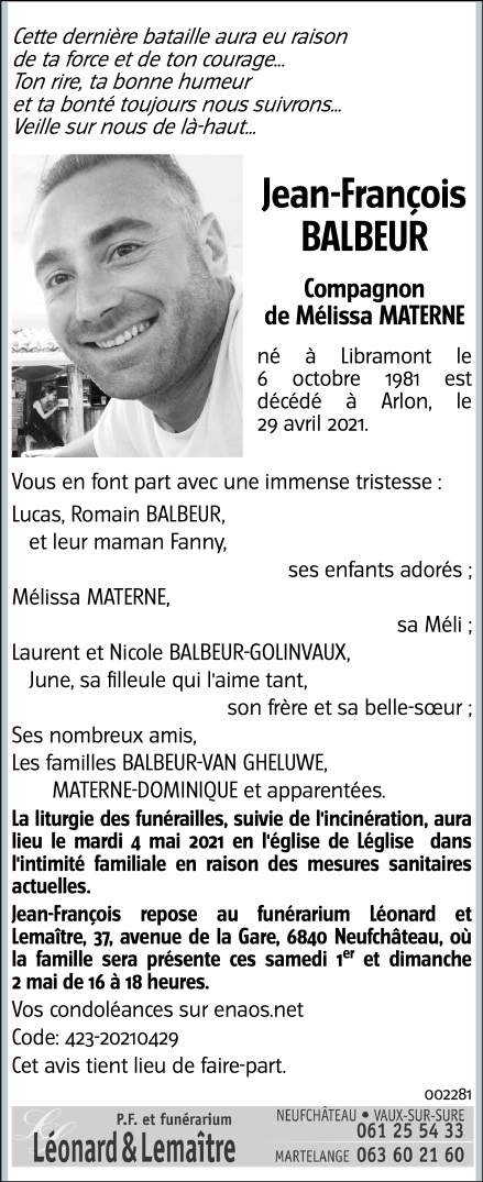 Décédé à Arlon (6700) le jeudi 29 avril 2021 à l'âge de 39 ans