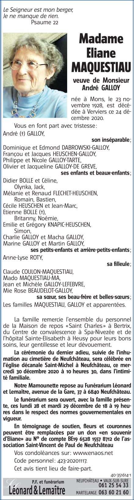 Décédée à Heusy (4802) le jeudi 24 décembre 2020 à l'âge de 92 ans