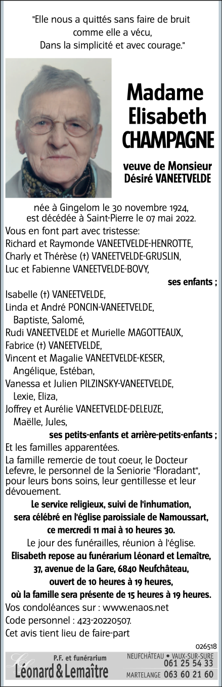 Décédée à Libramont-Chevigny (6800) le samedi 7 mai 2022 à l'âge de 97 ans