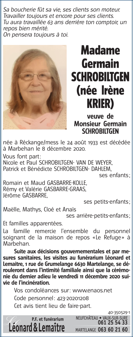 Madame Germain SCHROBILTGEN ( née Irène KRIER)