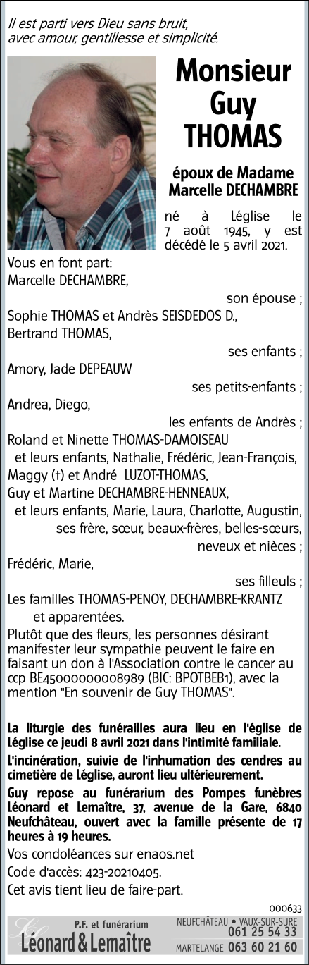Décédé à Léglise (6860) le lundi 5 avril 2021 à l'âge de 75 ans