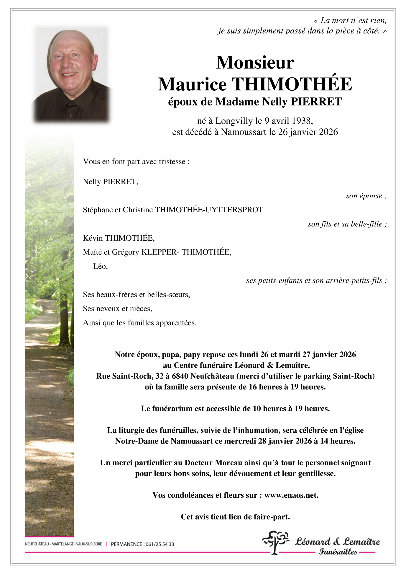 Décédé à Namoussart (6840) le lundi 26 janvier 2026 à l'âge de 87 ans