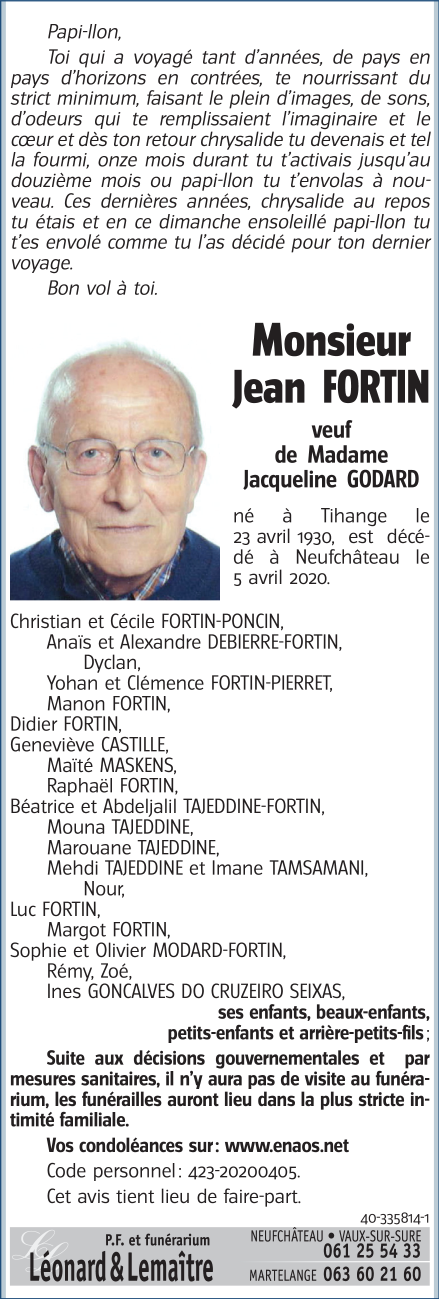 Décédé à Neufchâteau (6840) le dimanche 5 avril 2020 à l'âge de 89 ans