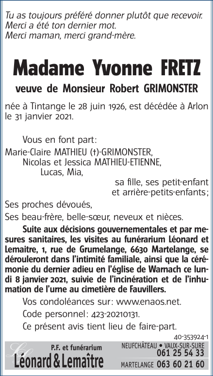 Décédée à Arlon (6700) le dimanche 31 janvier 2021 à l'âge de 94 ans