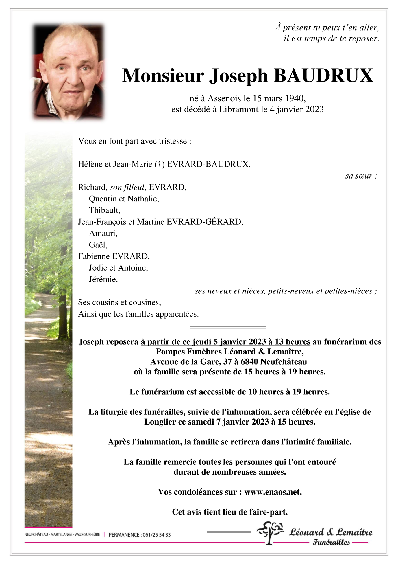 Décédé à Libramont-Chevigny (6800) le mercredi 4 janvier 2023 à l'âge de 82 ans