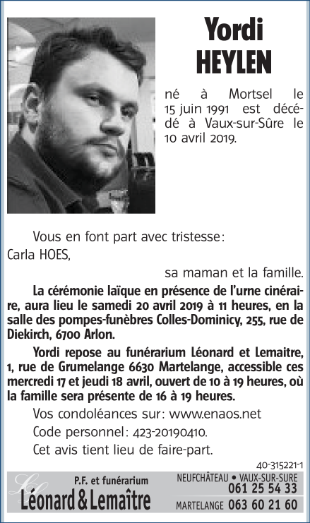 Décédé à Vaux-sur-Sure (6640) le mercredi 10 avril 2019 à l'âge de 27 ans