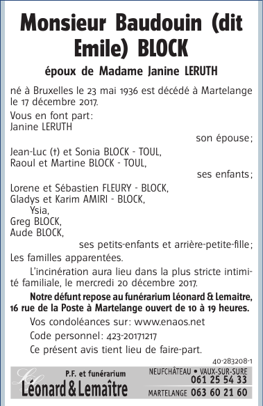 Décédé à Martelange (6630) le dimanche 17 décembre 2017 à l'âge de 81 ans