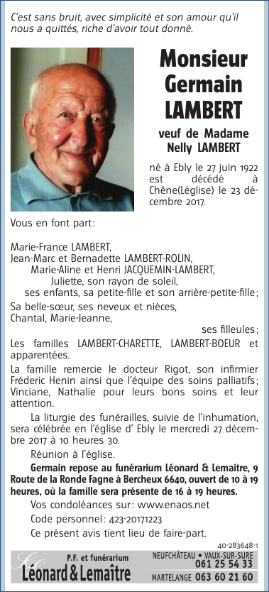 Décédé à Chêne (6860) le samedi 23 décembre 2017 à l'âge de 95 ans