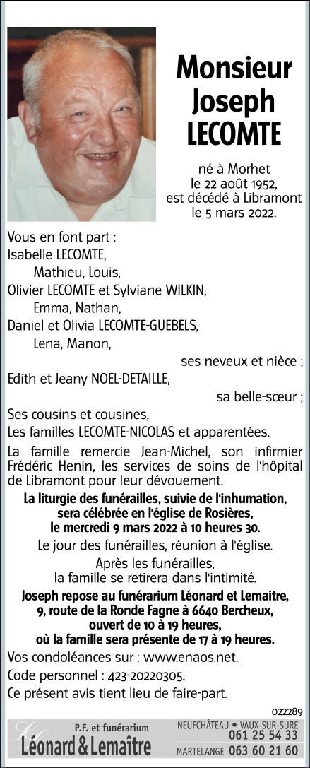 Décédé à Libramont-Chevigny (6800) le samedi 5 mars 2022 à l'âge de 69 ans