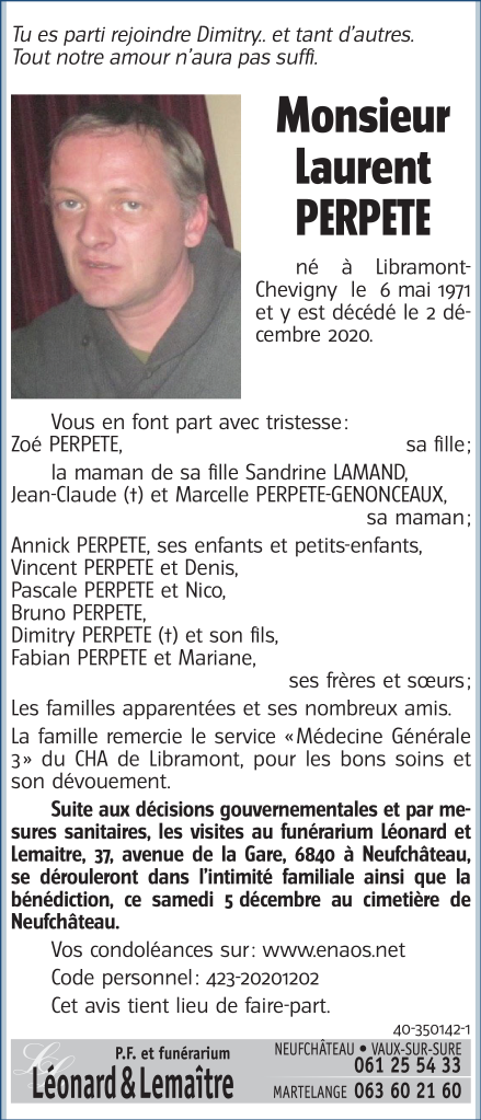 Décédé à Libramont-Chevigny (6800) le mercredi 2 décembre 2020 à l'âge de 49 ans