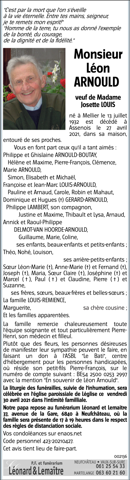 Décédé à Léglise (6860) le mardi 27 avril 2021 à l'âge de 88 ans
