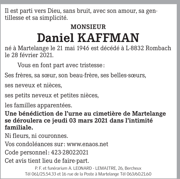 Décédé à Rombach-Martelange (8832, Luxembourg) le dimanche 28 février 2021 à l'âge de 74 ans