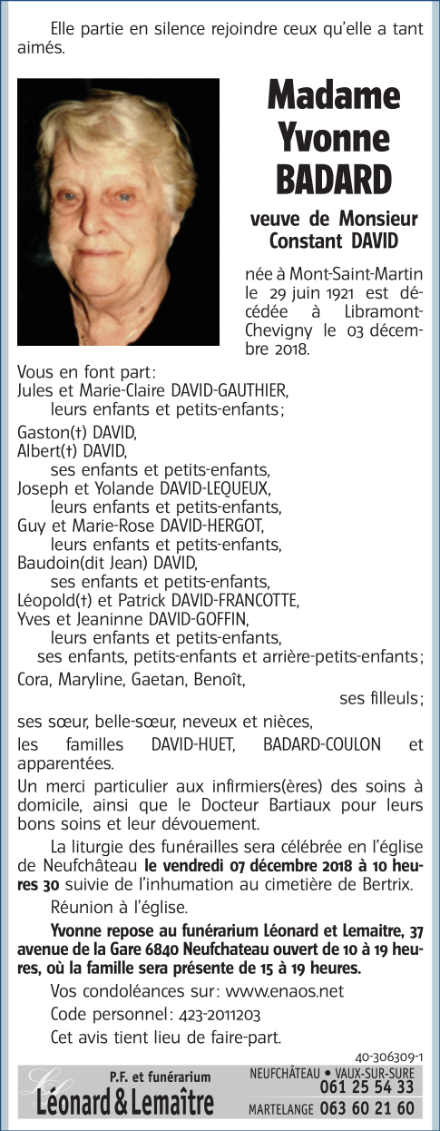 Décédée à Libramont-Chevigny (6800) le lundi 3 décembre 2018 à l'âge de 97 ans