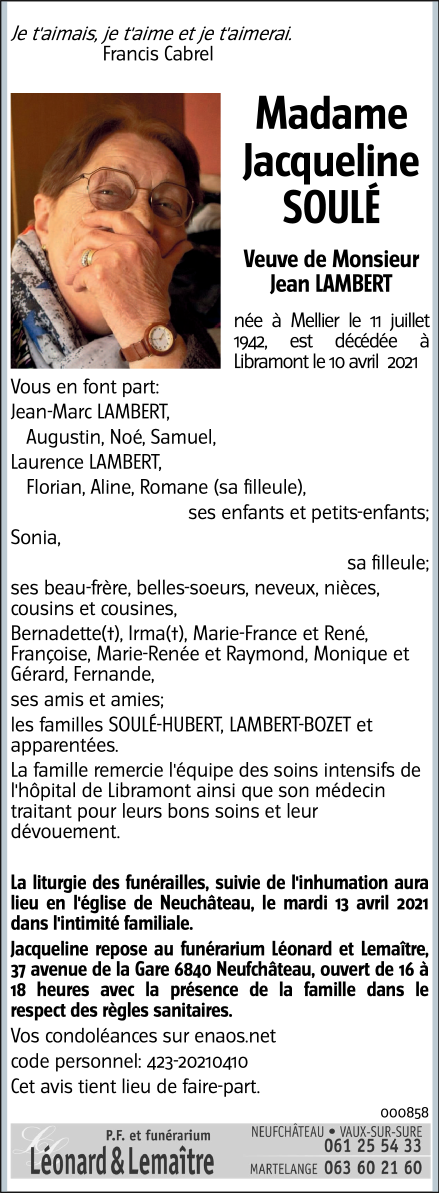 Veuve de Monsieur Jean LAMBERT