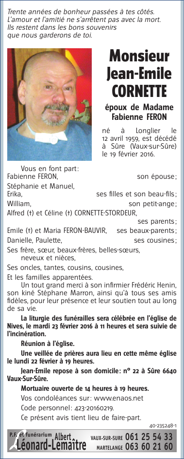 Décédé à Sûre (6640) le vendredi 19 février 2016 à l'âge de 56 ans