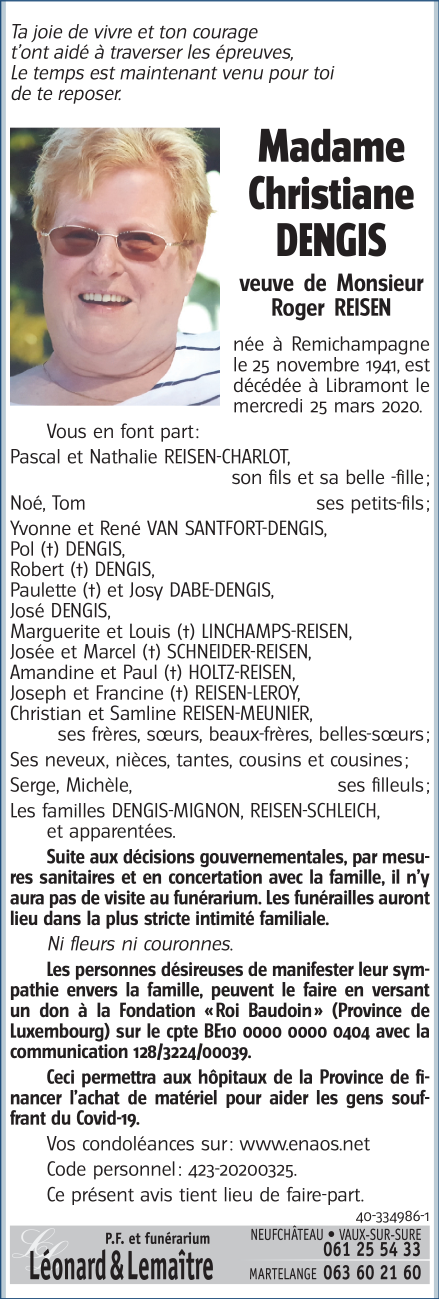 Décédée à Libramont (6800) le mercredi 25 mars 2020 à l'âge de 78 ans