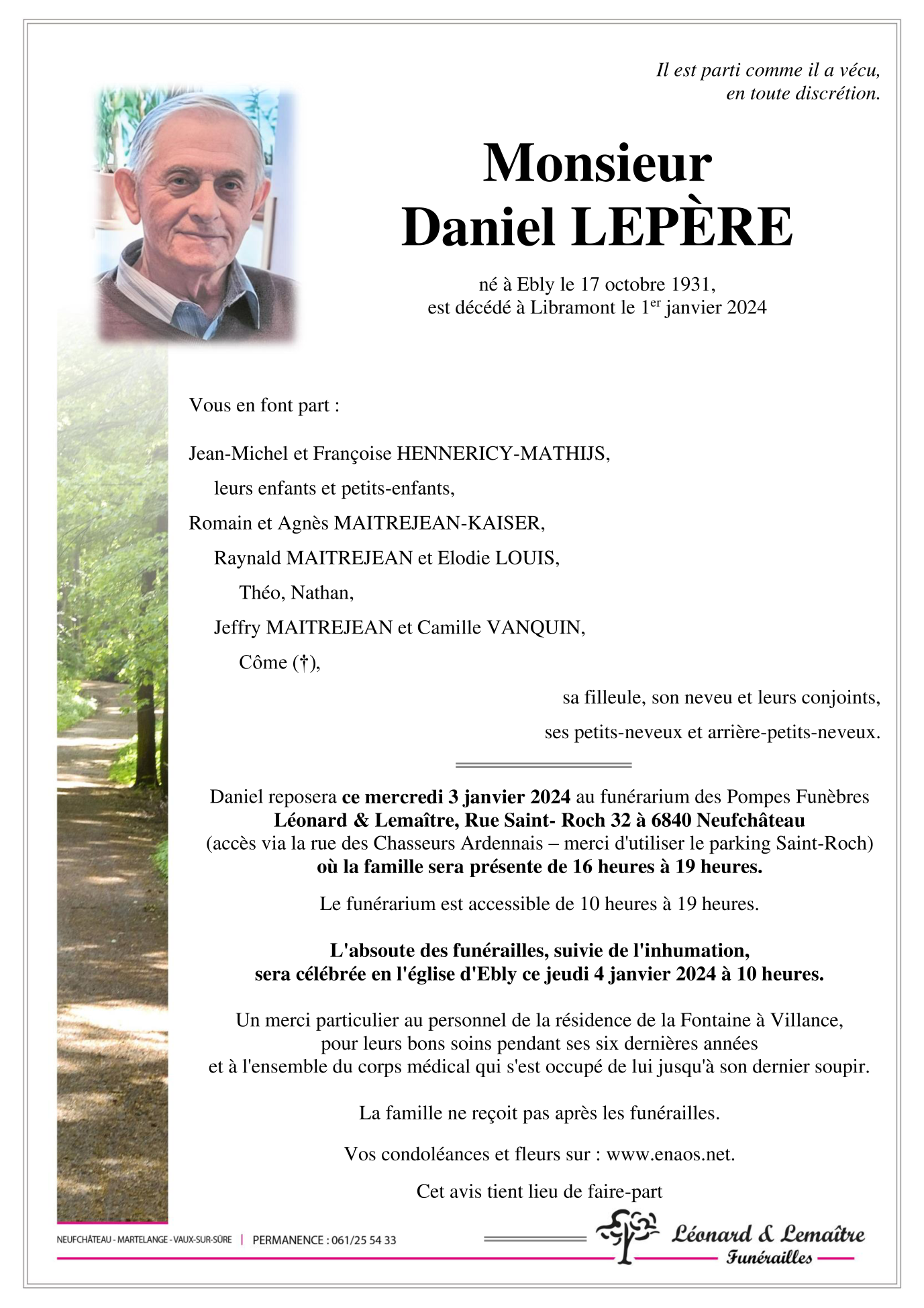 Décédé à Libramont-Chevigny (6800) le lundi 1 janvier 2024 à l'âge de 92 ans