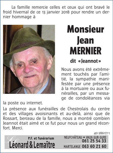Décédé à Neufchâteau (6840) le mardi 9 janvier 2018 à l'âge de 93 ans