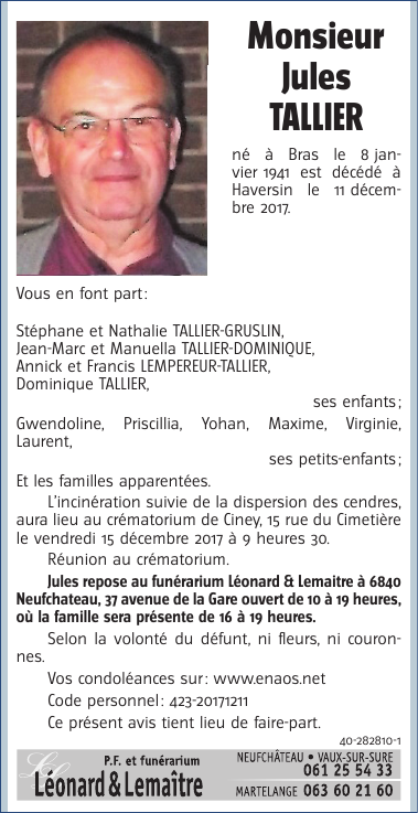 Décédé à Haid (5590) le lundi 11 décembre 2017 à l'âge de 76 ans