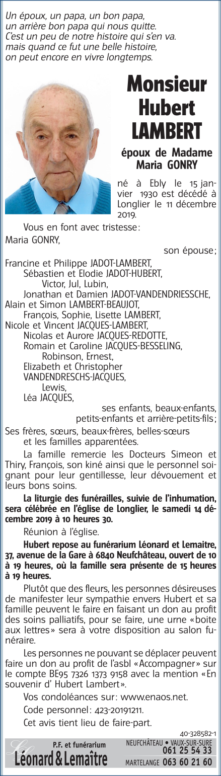 Décédé à Neufchâteau (6840) le mercredi 11 décembre 2019 à l'âge de 89 ans