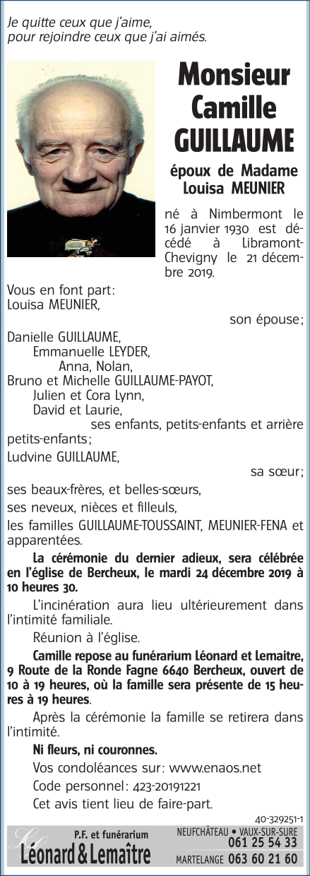 Décédé à Libramont-Chevigny (6800) le samedi 21 décembre 2019 à l'âge de 89 ans