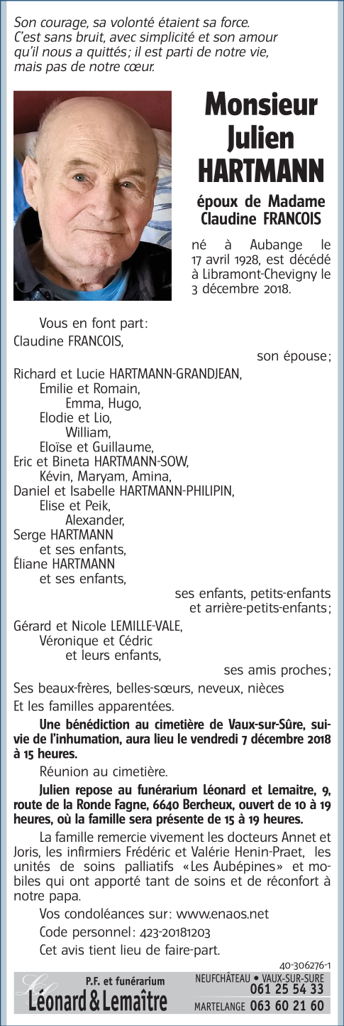 Décédé à Libramont-Chevigny (6800) le lundi 3 décembre 2018 à l'âge de 90 ans